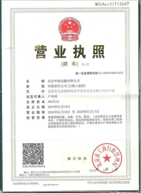 北京華銘運(yùn)輸有限公司,于2004年經(jīng)北京市工商局批準(zhǔn)注冊的有限責(zé)任公司(自然人獨(dú)資),注冊資金4560萬,總部位于北京,服務(wù)范圍遍及中國大陸地區(qū),核心業(yè)務(wù)包括物流運(yùn)輸,倉儲(chǔ),包裝及供應(yīng)鏈解決方案,為各行業(yè)、各類型商品、輔助品、半成品及原材料提供高品質(zhì)的專業(yè)物流服務(wù)。